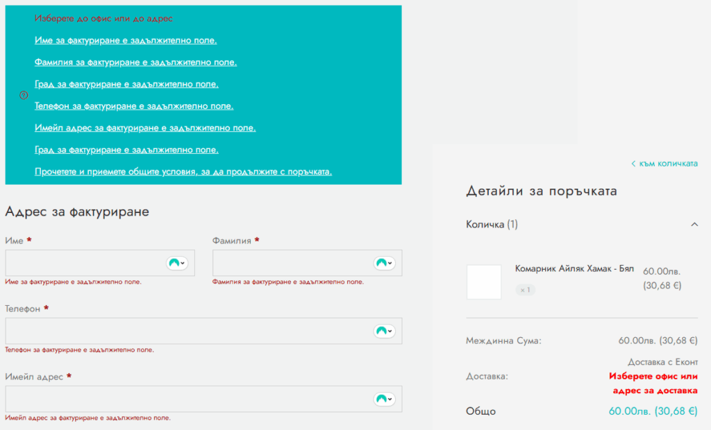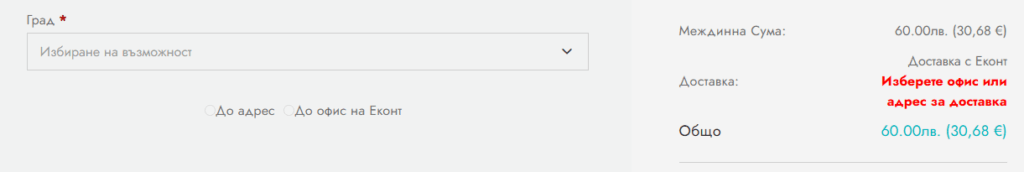Чекаут – доработен чекаут с добавена индивидуална интеграция за доставка с Еконт и защита от невъведени или неправилно въведени данни за доставка